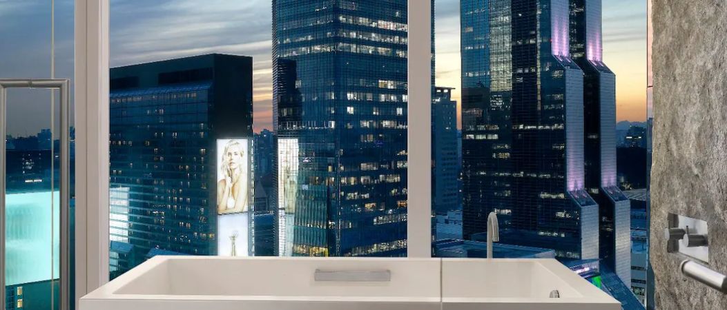 3️⃣ 객실 내 통유리 창문 너머로 보이는 겨울 도시의 야경 이곳은 일상의 피로를 잊고 한껏 호사를 누리고 싶은 사람들에게 강력 추천합니다. 🛁✨