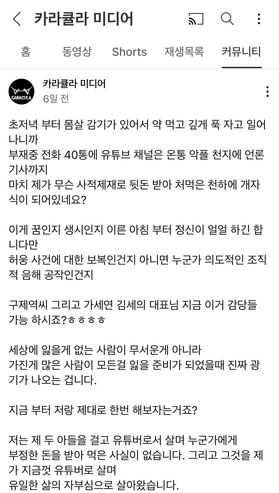 다음 날인 11일 오전, 카라큘라는 이에 대해 "초저녁부터 몸살감기가 있어서 약 먹고 깊게 푹 자고 일어나니까 부재중 전화 40통에 유튜브 채널은 온통 악플 천지에 언론 기사까지 마치 제가 무슨 사적 제재로 뒷돈 받아 처먹은 천하의 개자식이 됐다"라고 억울하다는 글을 게시했습니다. 그는 자신이 관련 상황에 대해 전혀 몰랐다는 입장을 밝혔습니다.